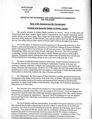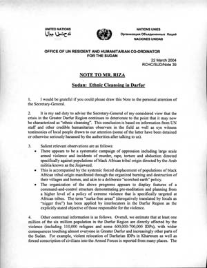 During 2003 and 2004, then-U.N. Resident and Humanitarian Coordinator in Sudan Mukesh Kapila wrote dozens of memos to his superiors at the United Nations, alerting them to the violence in Darfur. FRONTLINE has obtained two of those documents, addressed to former U.N. Emergency Relief Coordinator Jan Egeland and former Undersecretary-general for Political Affairs Kieran Prendergast, among others. The first memo, dated Dec. 18, 2003, describes Kapila's emergency relocation of some of his staff and Khartoum's obstruction of humanitarian access to refugees. The March 22, 2004 memo describes "ethnic cleansing," "systematic forced displacement," and "large scale armed violence and incidents of murder, rape, torture and abduction directed specifically against populations of black African tribal origin" showing signs of high-level organization. The memo estimates a total of "110,000 refugees and 600,000-700,000" internally displaced persons at that time. |
