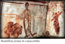 This is what they were. They were not hideouts, they were not places where Christians were hiding. They were quite public, where everyone was being buried of this class. So, Christians were being buried in the catacombs. If they were able economically to do more than simply bury their dead, if they could put an image there, for example, a picture, you began to get scenes. First of all, you got symbols like the anchor or the dove; that would be sort of the simplest one. Then you could get scenes like, say, the philosopher or the woman with her hands raised in prayer, the symbol of piety; various scenes, or you could get literally biblical stories.