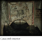 The catacombs hold a very interesting place in the romantic tradition about how early Christianity developed. It's often been suggested that these were great hiding places, and the Christians would go down in the catacombs to worship during periods of persecution. But really there weren't that regular kinds of persecution going on, and even when we find larger rooms or chambers in the catacombs, they weren't used for regular worship. Churches didn't go down in there to hold Eucharist and assembly on a regular basis. So, what were these rooms used for? Why did they have benches lining the walls, what looked like places where you could hold eucharistic assembly? The answer is, they're holding meals for the dead. We know, in fact, from a number of sources, Christian and non-Christian alike, that the funerary meal, a kind of picnic with the dead, was something that most families practiced in the city of Rome. So, we have to imagine as part of their daily life, as part of their regular activity, Christians, just like their pagan neighbors, going down into the catacombs to hold memorial meals with dead members of their families.