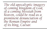 By the second century when Christianity is becoming a recognizable force in the Roman Empire there are some lingering political questions still attached to it. We have to remember that it was known that Jesus was executed as a political criminal and the gospel traditions themselves preserved this tradition of Pilate questioning Jesus. "Are you a king? Are you King of the Jews?" Now whether or not Pilate ever really asked that question of Jesus directly it does appear to be the case ... that Jesus claimed to be a king. A kind of Messianic claimant, "King of the Jews" was attached to his cross. That tradition, that legacy while it was a very important part of Christian confession and tradition also opened up another door of problems with regard to the Roman Empire because if somehow Christ was their king, it called into question their loyalty to the king, that is, the emperor of the Roman state. We have a case of kings and kingdoms in conflict. The old apocalyptic imagery of coming kingdom of God, of a coming Messiah from heaven, could be read as a prominent denunciation of the Roman Empire and of its king, Caesar.