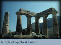 A typical visitor to the ancient city of Corinth would have approached the city along the paved stones of the Lechaion Road. On the right stood the great Temple of Apollo, built in the 6th century BCE; seven of its Doric columns still stand silhouetted against the Aegean sun. Only a few steps from the temple were the sacred springs of the Pierenne, where pilgrims had worshipped for centuries. Towering over the entire metropolis was the Acrocorinth, an immense outcropping that sheltered shrines sacred to the goddesses Aphrodite and Demeter.