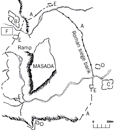 After the fall of Jerusalem, many Jewish rebels fled to the fortress atop the Rock of Masada. The Roman army followed and surrounded the hilltop fortress with a siege bank(A), six feet thick and over two miles long, fortified by towers every 60 to 80 yards. The large camp in the north-west corner(B) was the headquarters of the Roman commander, Silva. The other camps outside of the wall included a large compound on the east side (C) and two guard posts (D) to watch for those attempting escape from the fortress. The four smaller camps (E) integrated into the wall (E) could house up to five hundred Roman soldiers. The merchants which followed the Roman legions chose an area close to the headquarters (F) for their houses and brothels.