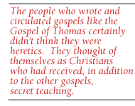 The people who wrote and circulated gospels like the Gospel of Thomas certainly didn't think they were heretics. They thought of themselves as Christians who had received, in addition to the other gospels, secret teaching. For example in the 4th chapter of the Gospel of Mark, Mark says that Jesus taught certain things privately to the disciples. And Paul too says that he had secret teaching. And these claim to give some of the secret teaching of Jesus. Whether he actually did teach secretly or not, we don't know otherwise. But the Gospel of Thomas claims to be this kind of secret teaching.
