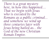 The Romans tried to beat down Christianity but failed. By the fourth century Christianity becomes the state religion and by the end of the fourth century it is illegal to do any form of public worship other than Christianity in the entire Roman Empire. There is a great mystery in how this happened -- how such an extraordinary reversal, that begins with Jesus who is executed by the Romans as a public criminal, as a threat to the social order, and somehow we wind up three centuries later with Jesus being hailed as a God, as part of the one, true God who is the God of the new Christian Roman Empire. There is a remarkable progress, a remarkable development in the course of three centuries. ... It's hard to understand exactly how it happened or why it happened, but it is important to realize that we have a progression and a set of developments, and that Christianity by the fourth century is not the same as the Christianity that we see in the first or even the second.