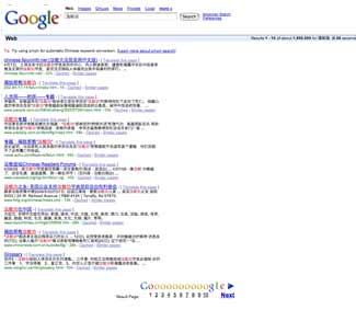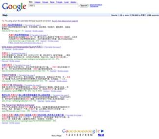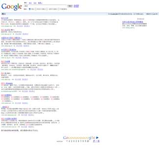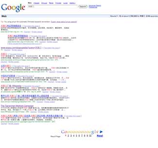Google.cn shows many links to sites that are unavailable in China: http://www.chinamz.org/ (China Magazine, a controversial publication), http://www.dpp.org.tw/ (the official site of Taiwan's pro-independence Democratic People's Party) and http://www.dphk.org/ (the Hong Kong Democratic Party). About 18.6 million pages indexed for this term, another example of Google.cn's less-than-perfect filtering of blacklisted content.