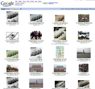 Google.com reveals many photos of Tiananmen Square, and several photos of soldiers. The first photo related to 1989, in the third row of results, is of former Secretary-General of the Chinese Communist Party Zhao Ziyang visiting the protesting students in Tiananmen Square. The fourth photo on that row is from the Epoch Times -- a publication often accused by the Chinese authorities of being associated with the banned Falun Gong movement.